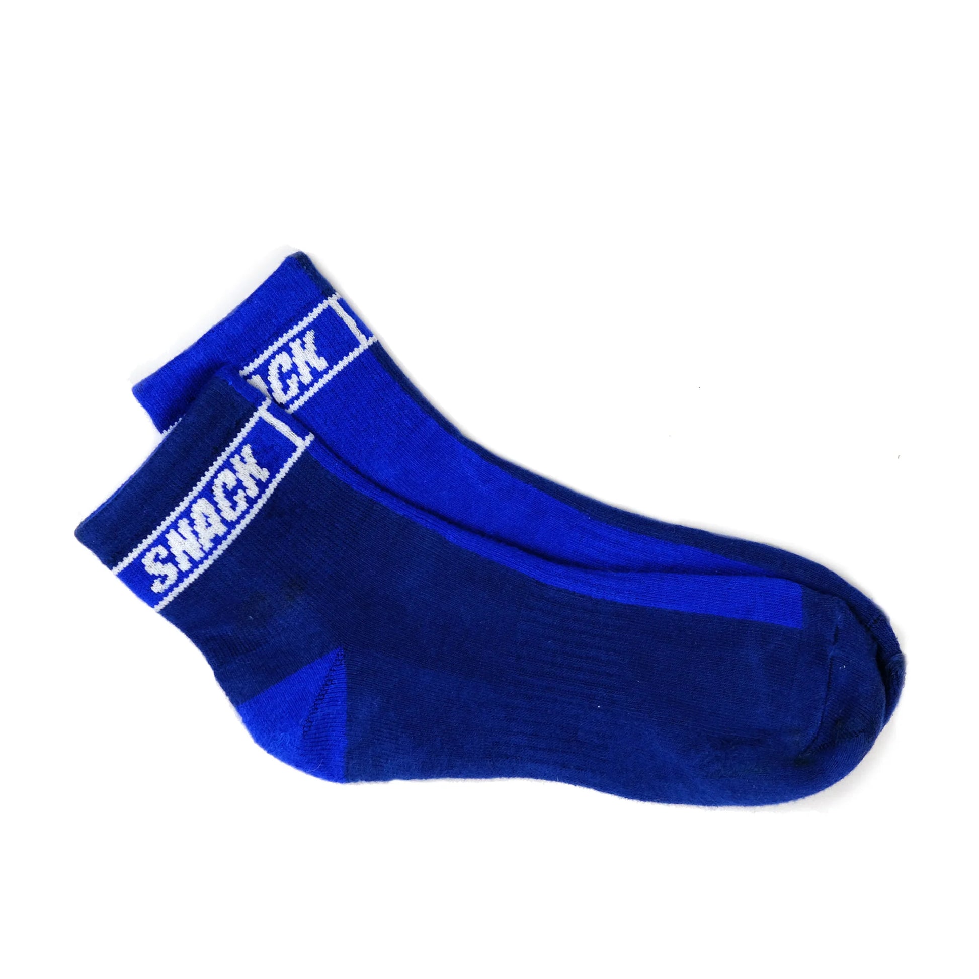 Calcetín de dos colores azul marino/indgo con el logotipo 'SNACK' repetido alrededor del tobillo
