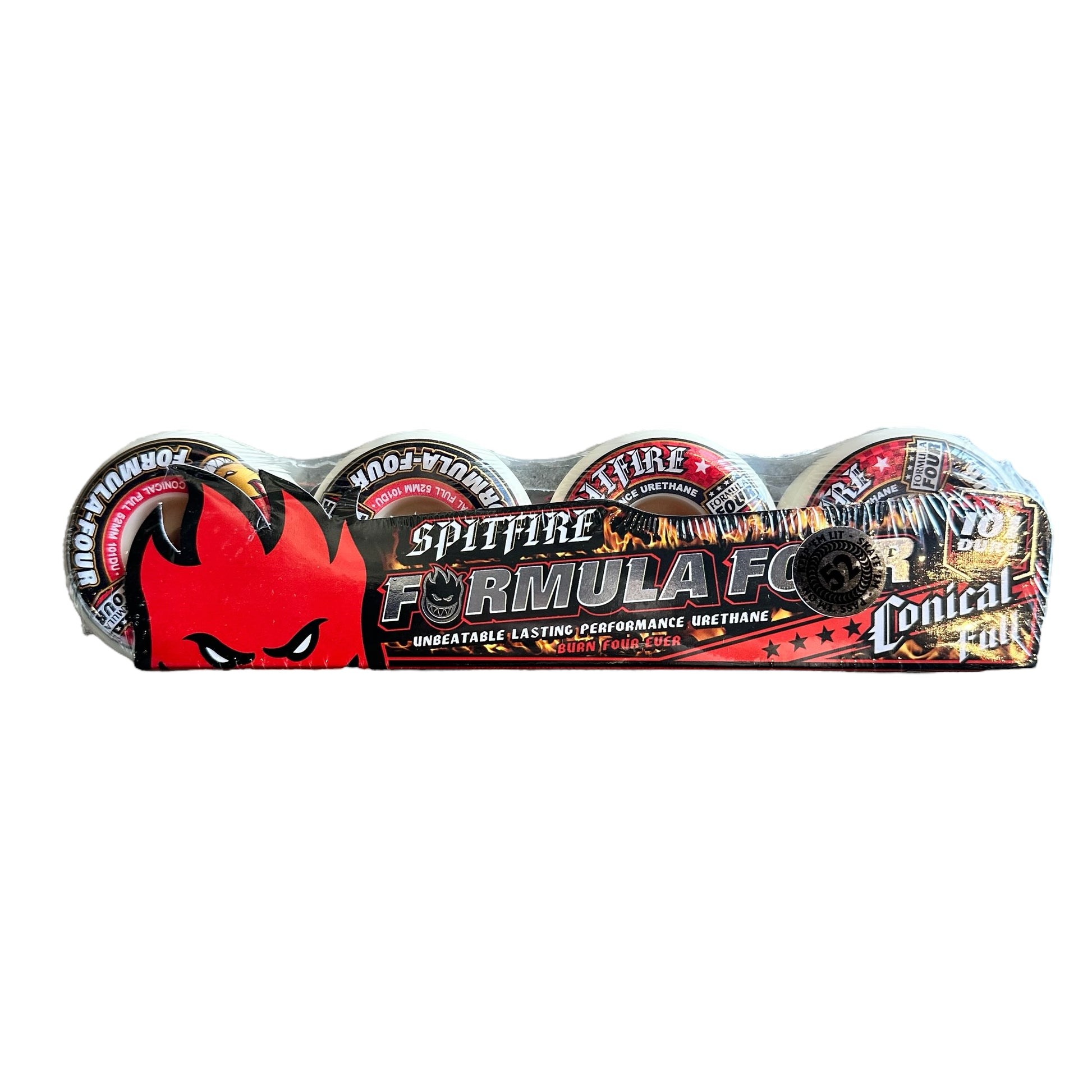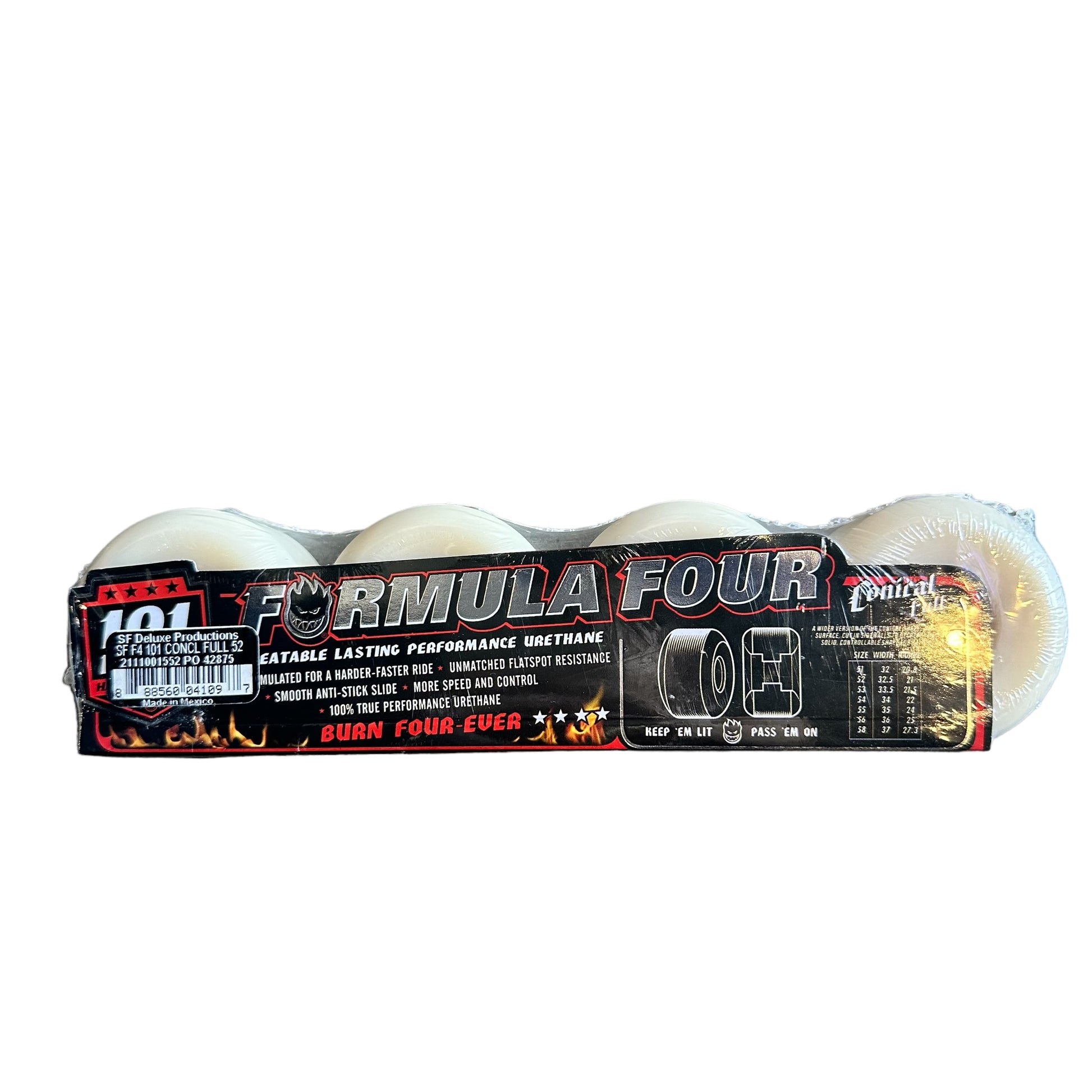 Fórmula Cuatro 101 Duro Uretano: Para una conducción más rápida y resistente. Rendimiento comprobado de Fórmula Cuatro, fabricado en la zona euro más resistente de Spitfire para mayor velocidad.
