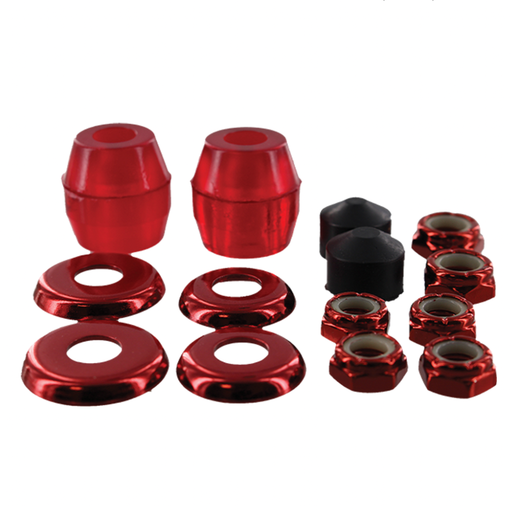 Este kit viene completo para revitalizar tus ejes y darles la potencia de giro que esperas de un skater. Giros y volteretas rápidos y con gran respuesta, ¡claro que sí! El kit de reconstrucción incluye dos (2) bujes superiores rojos de 90 A y dos (2) bujes inferiores, dos (2) arandelas de copa superiores y dos (2) inferiores de acero endurecido. Además, incluye dos (2) tuercas de pivote y dos (2) tuercas de eje en un elegante negro anodizado. Finalmente, dos (2) copas de pivote.