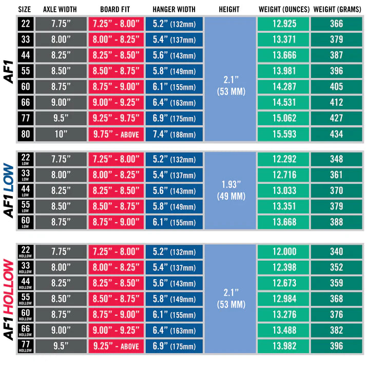 The all-new ACE AF1 HOLLOWS features hollow axle and kingpin, making for the lightest AF1 to date. The AF1 is carefully manufactured using our proprietary casting process. Years in development, the ACE AF1 has a 70% increase in the aluminum’s structural integrity, making it the strongest cast truck on the market.